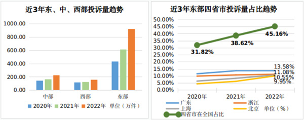從近三年趨勢看,因平臺經(jīng)濟(jì)的跨區(qū)域擴(kuò)張、人口資本的跨區(qū)域流動、市場要素的跨區(qū)域配置,廣東、浙江、上海、北京4個省市的消費(fèi)正在加速集聚。消費(fèi)投訴數(shù)量與消費(fèi)活躍水平呈正相關(guān)關(guān)系,四省市消費(fèi)投訴數(shù)量在全國的占比從2020年的31.8%增長到2022年的45.16%。消費(fèi)投訴的加速集聚在一定程度上反映了消費(fèi)供給側(cè)發(fā)展的不平衡,需要進(jìn)一步恢復(fù)和擴(kuò)大中西部地區(qū)消費(fèi),推動更高質(zhì)量、更加平衡的發(fā)展。