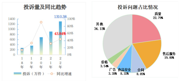 2022年,全國市場監(jiān)管部門受理消費(fèi)者投訴1310.38萬件,同比增長43.84%,增速較2021年有所放大。從投訴問題看,質(zhì)量298.70萬件、售后服務(wù)248.96萬件、合同115.91萬件、食品安全109.06萬件,合計占投訴的58.96%。其中,售后服務(wù)問題增長最快,群眾反映最強(qiáng)烈,同比增長57.67%。