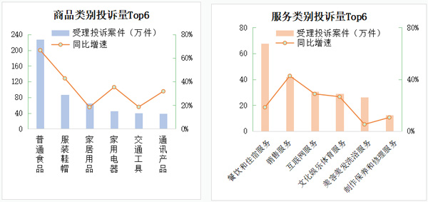 2022年,全國市場監(jiān)管部門共受理商品投訴862.32萬件,占投訴的65.81%,較上年提高4.37個百分點(diǎn);服務(wù)投訴448.06萬件,占投訴的34.19%。商品類投訴占比提升,反映了實(shí)體經(jīng)濟(jì)下行壓力下產(chǎn)品質(zhì)量問題凸顯,其中投訴量靠前的是:普通食品、服裝鞋帽、家居用品、家用電器、交通工具、通訊產(chǎn)品,占比58.43%。服務(wù)投訴量靠前的是:餐飲住宿、銷售、互聯(lián)網(wǎng)服務(wù)、文化娛樂體育、美容美發(fā)洗浴,占比46.37%。
