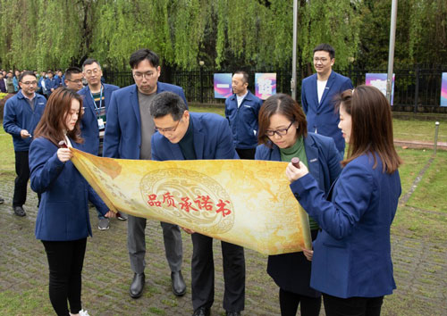 公司高階管理層在升旗儀式上帶頭簽署品質承諾書,以此正式拉開了品質月活動的序幕。