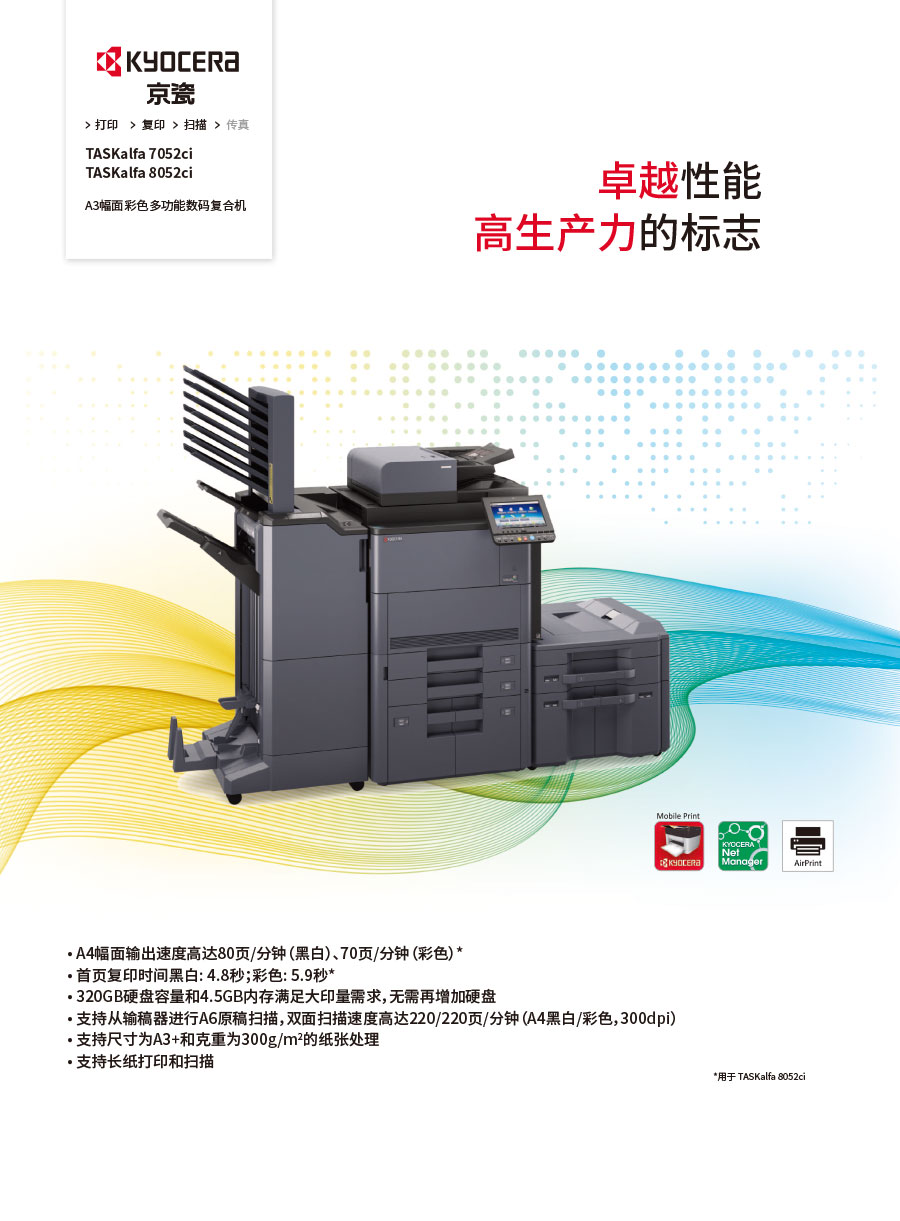 主要產品:KYOCERA京瓷激光打印機,一體機,復合機,生產型彩色噴墨數碼印刷系統(tǒng)及辦公信息系統(tǒng)的開發(fā)、設計、系統(tǒng)集成