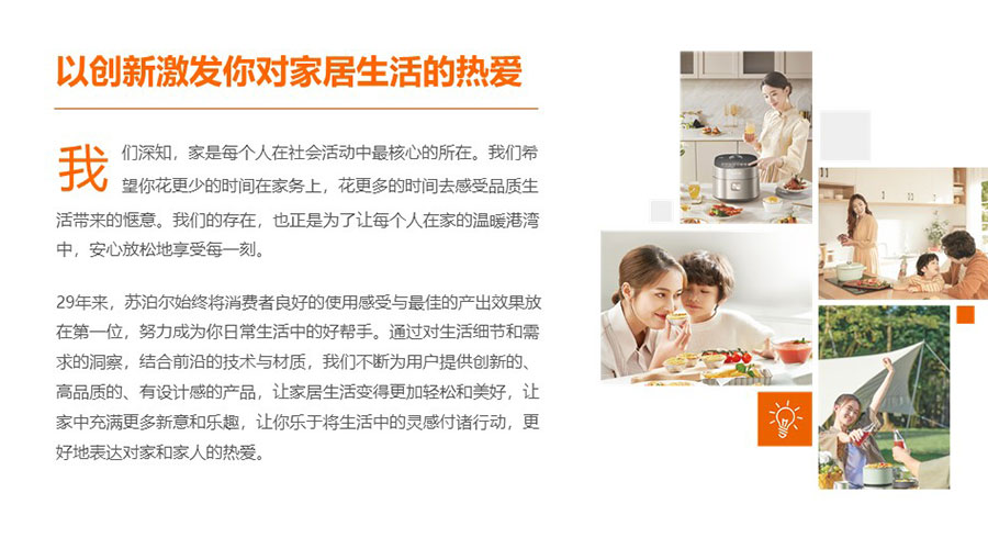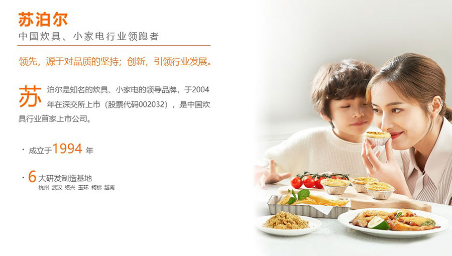 蘇泊爾始終貫徹和奉行“讓每一天的生活更輕松”的企業(yè)使命、秉承“以人為本、客戶導向、系統(tǒng)規(guī)劃、高效執(zhí)行”的經營理念,踐行“愛國、謙遜、務實、創(chuàng)新、超越”的企業(yè)作風,追求卓越品質,堅持創(chuàng)新能力,努力成為引領中國炊具、廚房電器行業(yè)的研發(fā)制造商。
