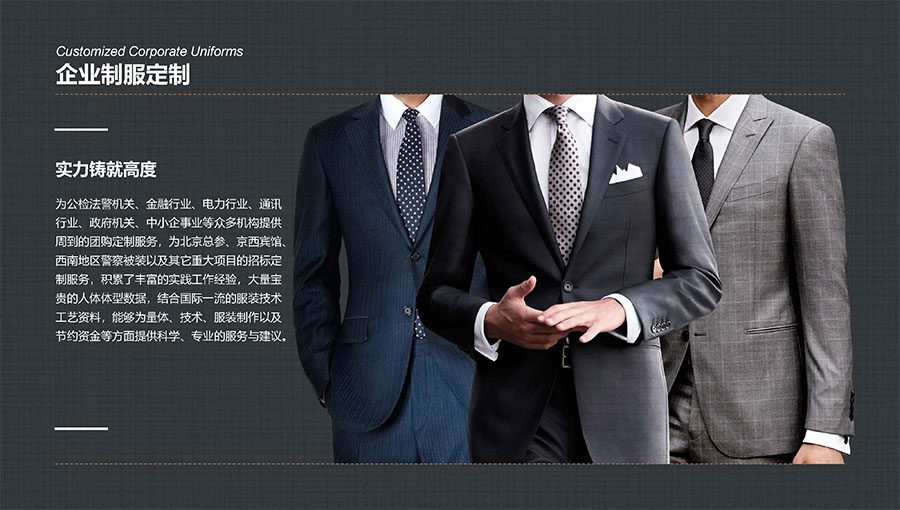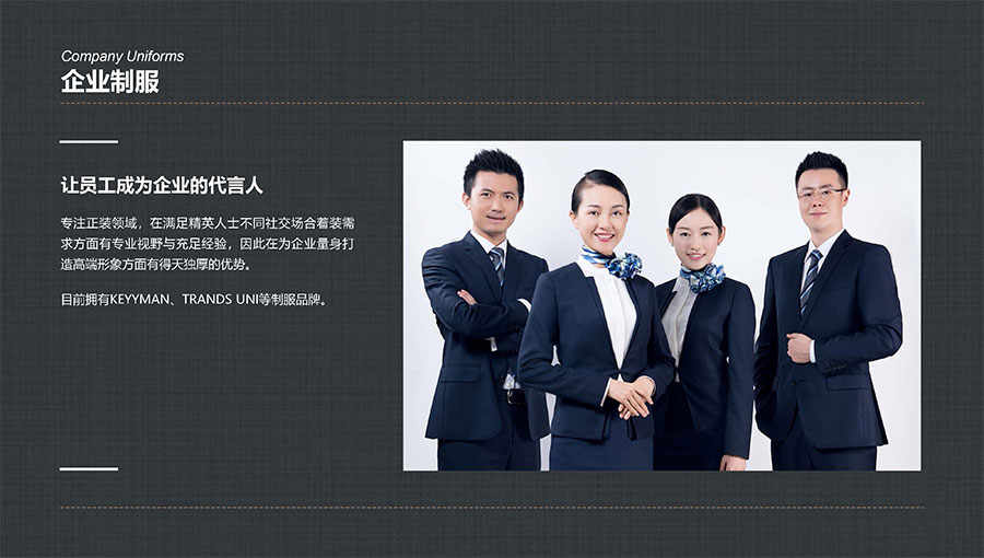 凱門品牌(KEYYMEN):高級職業(yè)裝品牌,企業(yè)形象定制專家。以精湛工藝及最優(yōu)性價比打造高品質(zhì)、個性時尚的企業(yè)形象,專屬于那些為理想、為事業(yè)打拼,并在成功過程中享受生活的職場團(tuán)隊及精英人士。