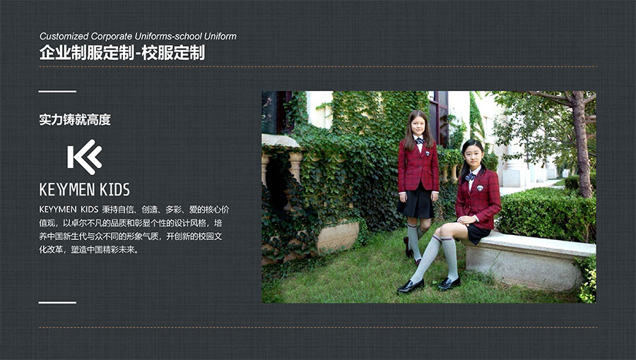 凱門學(xué)生裝(KEYYMEN KIDS)秉持自信、創(chuàng)造、多彩、愛的核心價值觀,堅持“領(lǐng)先一步,步步領(lǐng)先”的品牌理念,致力于打造最具影響力的學(xué)生裝品牌,為中國青少年形象代言,以卓爾不凡的品質(zhì)和彰顯個性的設(shè)計風(fēng)格,培養(yǎng)中國青少年與眾不同的形象氣質(zhì)。