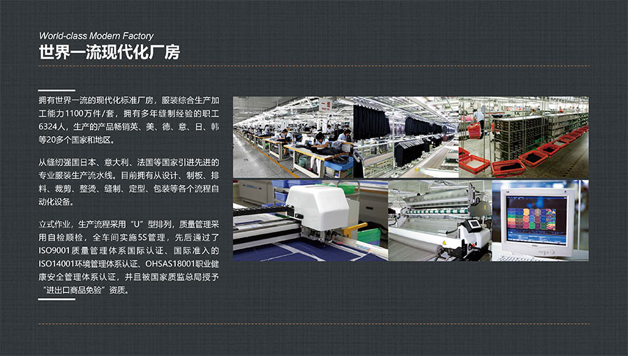 多年來,大楊集團(tuán)深耕主業(yè)、堅守實業(yè),積極開拓國內(nèi)外高端服裝市場,年服裝綜合生產(chǎn)加工能力1100萬件/套,其中年定制服裝生產(chǎn)數(shù)量穩(wěn)居全球第一。年西服出口量600萬件/套,連續(xù)多年排名全國第一。先后被評為世界服裝行業(yè)五百強企業(yè)、全國服裝行業(yè)十強/百強企業(yè)、國家重點扶持的中國名牌出口企業(yè)、國家級重合同守信譽單位、國家級服務(wù)型制造示范企業(yè)、國家重點培育紡織服裝百家品牌、遼寧省數(shù)字化轉(zhuǎn)型標(biāo)桿企業(yè),榮獲全國五一勞動獎狀、全國文明單位、全國紡織行業(yè)先進(jìn)集體、全國抗擊新冠肺炎疫情先進(jìn)民營企業(yè)、省長質(zhì)量獎等稱號,入選“中國服裝智能制造技術(shù)創(chuàng)新戰(zhàn)略聯(lián)盟”創(chuàng)始會員。同時,大楊集團(tuán)還在同行業(yè)中率先通過“AAA級兩化融合管理體系”評定,以及ISO9001質(zhì)量管理體系國際認(rèn)證、國際準(zhǔn)入的ISO14001環(huán)境管理體系認(rèn)證、ISO45001職業(yè)健康安全管理體系認(rèn)證。
