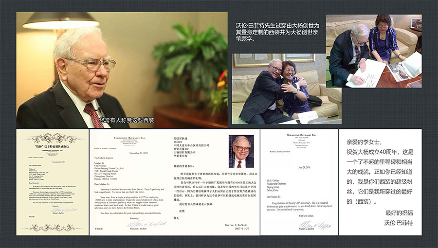 大楊集團(tuán)堅持做民族品牌,揚國人志氣,致力打造國際一流服裝品牌。上世紀(jì)90年代創(chuàng)立了第一個自主品牌——TRANDS(創(chuàng)世),先后榮獲“中國出口名牌”、“中國名牌產(chǎn)品”等稱號,并獲得中國服裝協(xié)會頒發(fā)的中國服裝品牌品質(zhì)大獎,成為當(dāng)今中國高級男裝的領(lǐng)軍品牌之一。TRANDS(創(chuàng)世)品牌申報國家非遺創(chuàng)新產(chǎn)品的“‘龍’金絲蘇繡中式華服”被授予十大類紡織創(chuàng)新產(chǎn)品。“股神”沃倫·巴菲特、微軟主席比爾·蓋茨、世界經(jīng)濟(jì)論壇主席克勞斯·施瓦布等國際精英人士,均已成為品牌的忠實客戶。目前,大楊集團(tuán)已形成以高級男裝品牌TRANDS(創(chuàng)世)為龍頭,團(tuán)體定制高級商務(wù)裝品牌KEYMEN(凱門)、高級定制品牌凱門定制、網(wǎng)上直銷品牌YOUSOKU(優(yōu)·搜·酷)、學(xué)生裝品牌KEYMEN KIDS等組成的自主品牌梯隊。