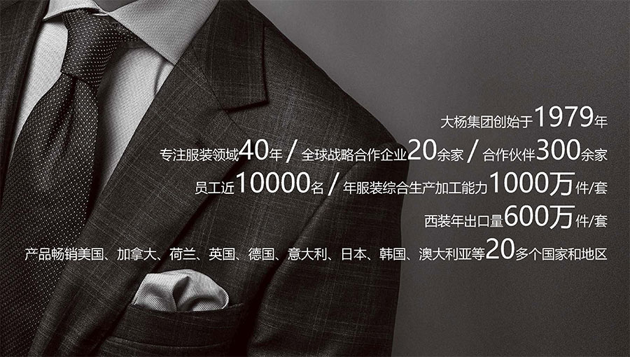 大楊集團(tuán)創(chuàng)建于1979年,總部位于遼寧省大連市,主要生產(chǎn)和銷售各類中高檔服裝產(chǎn)品為主的國際化大型服裝企業(yè),以西裝縫制享譽全球,是世界重要的西裝生產(chǎn)加工基地?,F(xiàn)有直屬(控股)成員企業(yè)20家,員工4500人??毓勺庸敬筮B大楊創(chuàng)世股份有限公司2000年在上海證券交易所上市,并于2016年完成重大資產(chǎn)重組。