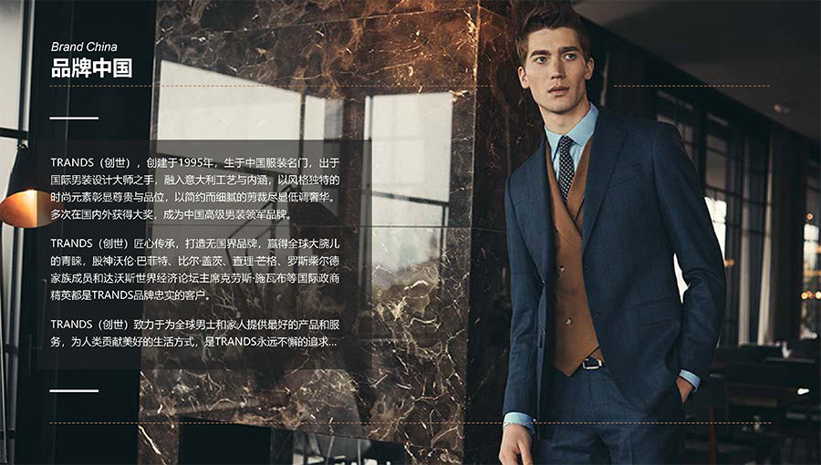 創(chuàng)世品牌(TRANDS):創(chuàng)建于1995年,是當(dāng)今中國高級男裝的代表品牌之一。TRANDS創(chuàng)世成衣產(chǎn)品及量身定制的西裝以其至臻品質(zhì)和精湛工藝,贏得眾多國際政商精英多年來的青睞。