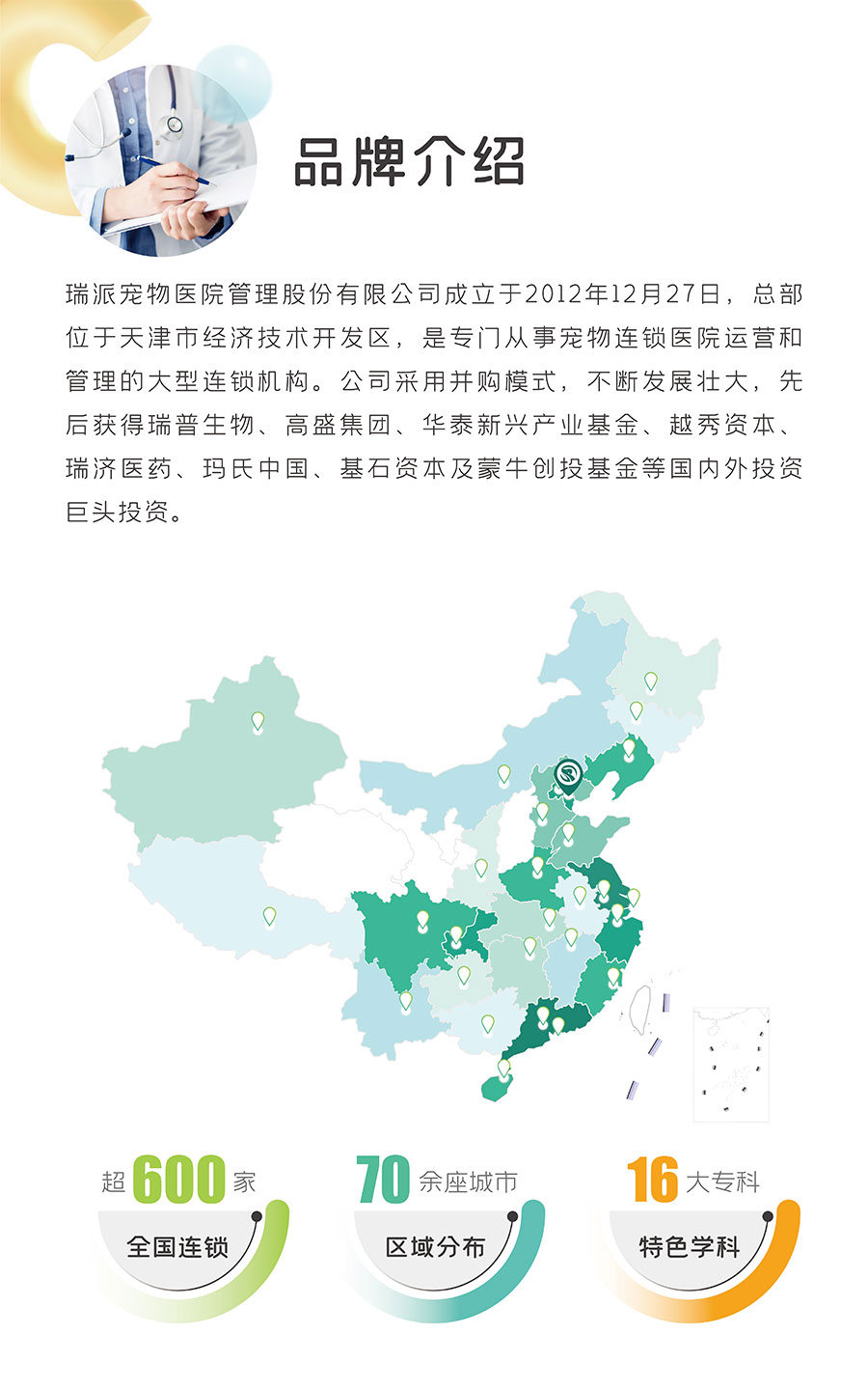 瑞派寵物醫(yī)院管理股份有限公司成立于2012年12月27日,總部位于天津市經(jīng)濟(jì)技術(shù)開發(fā)區(qū),是專門從事寵物連鎖醫(yī)院運(yùn)營(yíng)和管理的大型連鎖機(jī)構(gòu)。公司采用并購(gòu)模式,不斷發(fā)展壯大,先后獲得瑞普生物、高盛集團(tuán)、華泰新興產(chǎn)業(yè)基金、越秀資本、瑞濟(jì)醫(yī)藥、瑪氏中國(guó)、基石資本及蒙牛創(chuàng)投基金等國(guó)內(nèi)外投資巨頭投資。