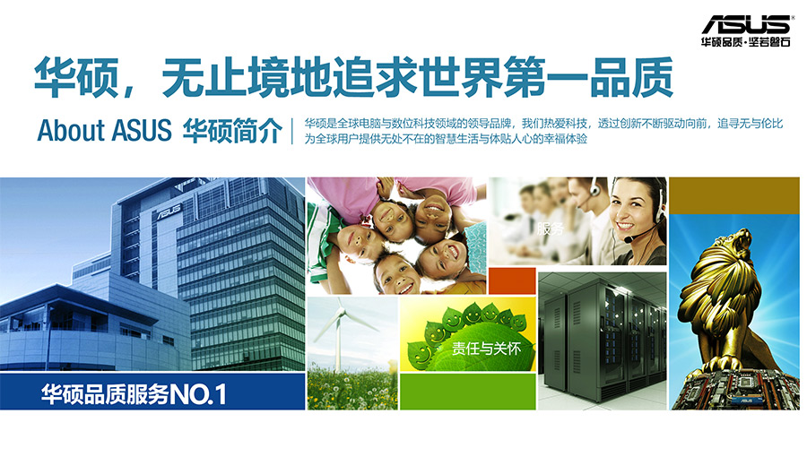 人文的華碩——華碩設(shè)計(jì)思維始于以人為本,展現(xiàn)出杰出的品質(zhì)和無(wú)與倫比的創(chuàng)新精神,堅(jiān)持將每件事做到極致。成立以來(lái),華碩人秉承謙、誠(chéng)、勤、敏、勇五徳,著眼未來(lái),通過(guò)創(chuàng)新不斷驅(qū)動(dòng)向前,追求卓越勇于接受挑戰(zhàn),形成了與眾不同的企業(yè)文化。經(jīng)營(yíng)理念上,堅(jiān)持培育、珍惜、關(guān)懷員工,讓華碩人盡情地發(fā)揮自身潛力;堅(jiān)守誠(chéng)信、勤儉、崇本、務(wù)實(shí)的正道;堅(jiān)持不懈追求更高的品質(zhì)、速度、服務(wù)、創(chuàng)新、成本,立志以綠色科技為人類社會(huì)環(huán)境真正做出貢獻(xiàn)。