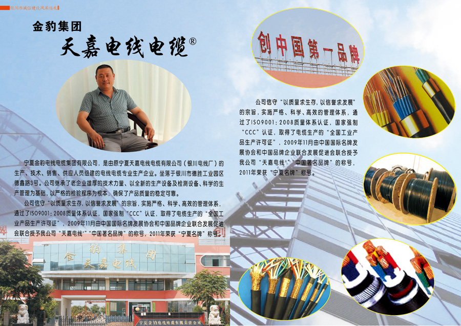 公司信守“以質(zhì)量求生存,以信譽(yù)求發(fā)展”的宗旨,實(shí)施嚴(yán)格、科學(xué)、高效的管理體系,通過了ISO9001:2008質(zhì)量體系認(rèn)證,國家強(qiáng)制“CCC”認(rèn)證,取得了電纜生產(chǎn)的“全國工業(yè)產(chǎn)品生產(chǎn)許可證”,2009年由中國國際名牌發(fā)展協(xié)會和中國品牌企業(yè)聯(lián)合發(fā)展促進(jìn)會聯(lián)合授予公司“天嘉電線®”“中國著名品牌”的稱號,2011年榮獲“寧夏名牌”稱號。公司是寧夏質(zhì)量管理協(xié)會副會長單位、銀川市質(zhì)量管理協(xié)會理事單位、賀蘭縣質(zhì)量管理協(xié)會理事單位、中國電器工業(yè)協(xié)會電線電纜分會會員單位。