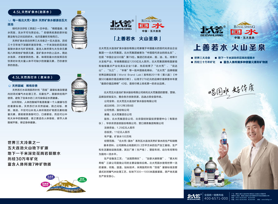 北大荒五大連池礦泉水股份有限公司成立于2012年3月8日,隸屬于北大荒集團(tuán)總公司,其股東為:北大荒集團(tuán)總公司、北京國經(jīng)財(cái)富投資管理中心(有限合伙)、華農(nóng)農(nóng)資連鎖股份有限公司、營口港務(wù)集團(tuán)有限公司。其注冊資金1.25億元人民幣,總投資11億元人民幣。北大荒五大連池礦泉水股份有限公司擁有占地面積20.3萬平方米的生產(chǎn)加工基地,生產(chǎn)和生活基礎(chǔ)設(shè)施完善,由主廠房(生產(chǎn)線)、塑膠車間、動(dòng)力車間、辦公樓、食堂宿舍及相關(guān)附屬設(shè)施組成。其經(jīng)營范圍為“北大荒•國水”系列五大連池天然礦泉水的生產(chǎn)和銷售,礦泉水年產(chǎn)量100萬噸。