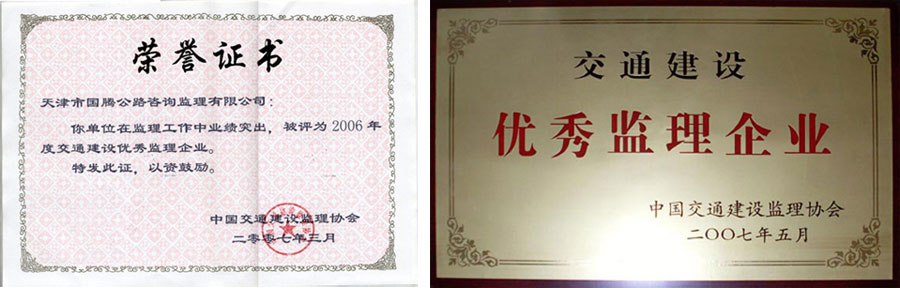 由于工作業(yè)績(jī)突出,1999年公司被評(píng)為行業(yè)“九五”立功先進(jìn)單位,2000年獲得“九五”全國(guó)干線公路檢查評(píng)比立功單位,2001年被評(píng)為公路系統(tǒng)文明窗口,2002年被評(píng)為行業(yè)文明創(chuàng)建達(dá)標(biāo)單位,2003年至2005年被評(píng)為先進(jìn)監(jiān)理單位,2006年被評(píng)為公路行業(yè)“十五”期文明服務(wù)品牌、“交通建設(shè)優(yōu)秀監(jiān)理企業(yè)”,2000年至2007年連續(xù)被評(píng)為公路局先進(jìn)單位、公路系統(tǒng)文明窗口;連續(xù)八年五年獲得公路局“優(yōu)秀領(lǐng)導(dǎo)班子”的榮譽(yù)稱號(hào)。
