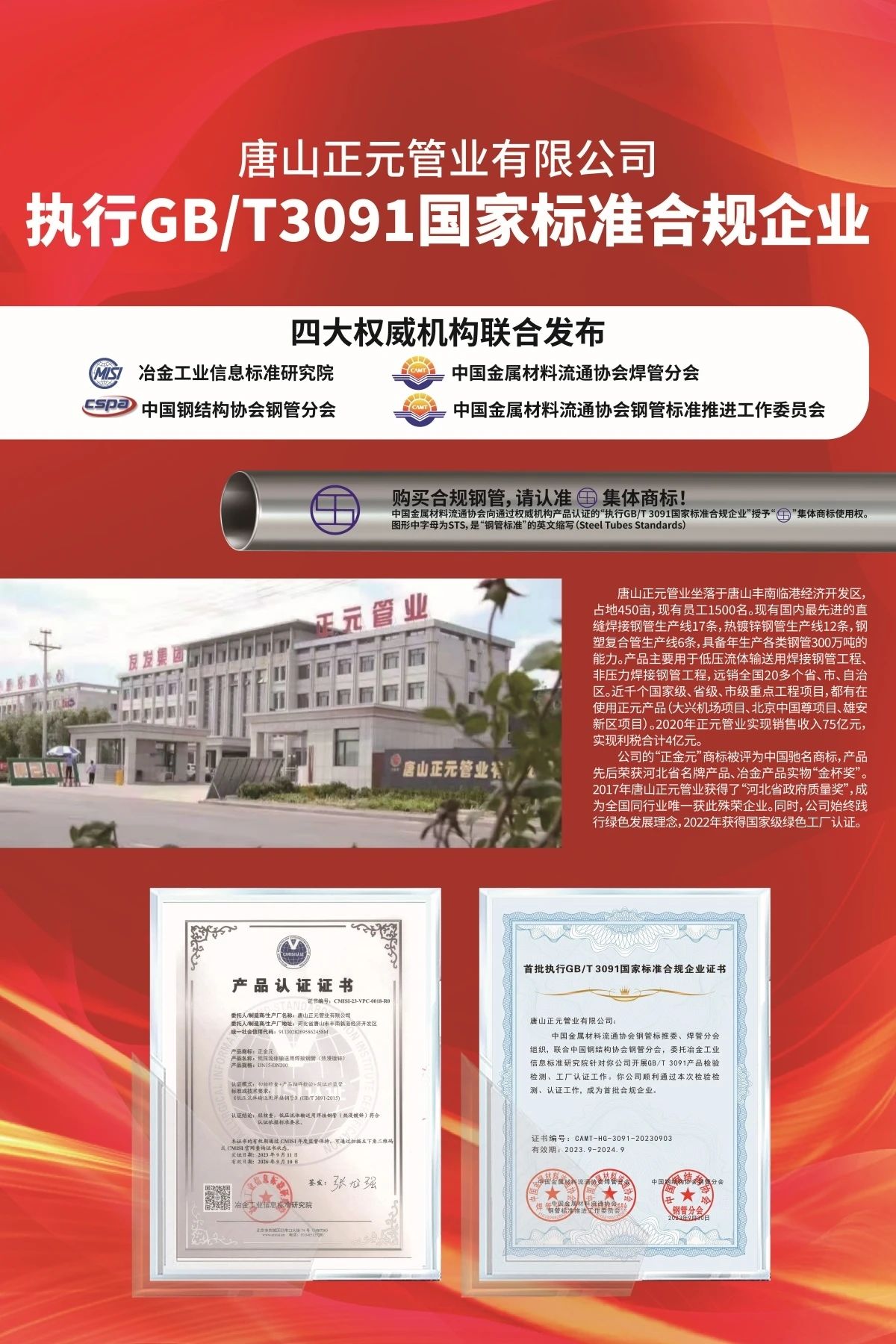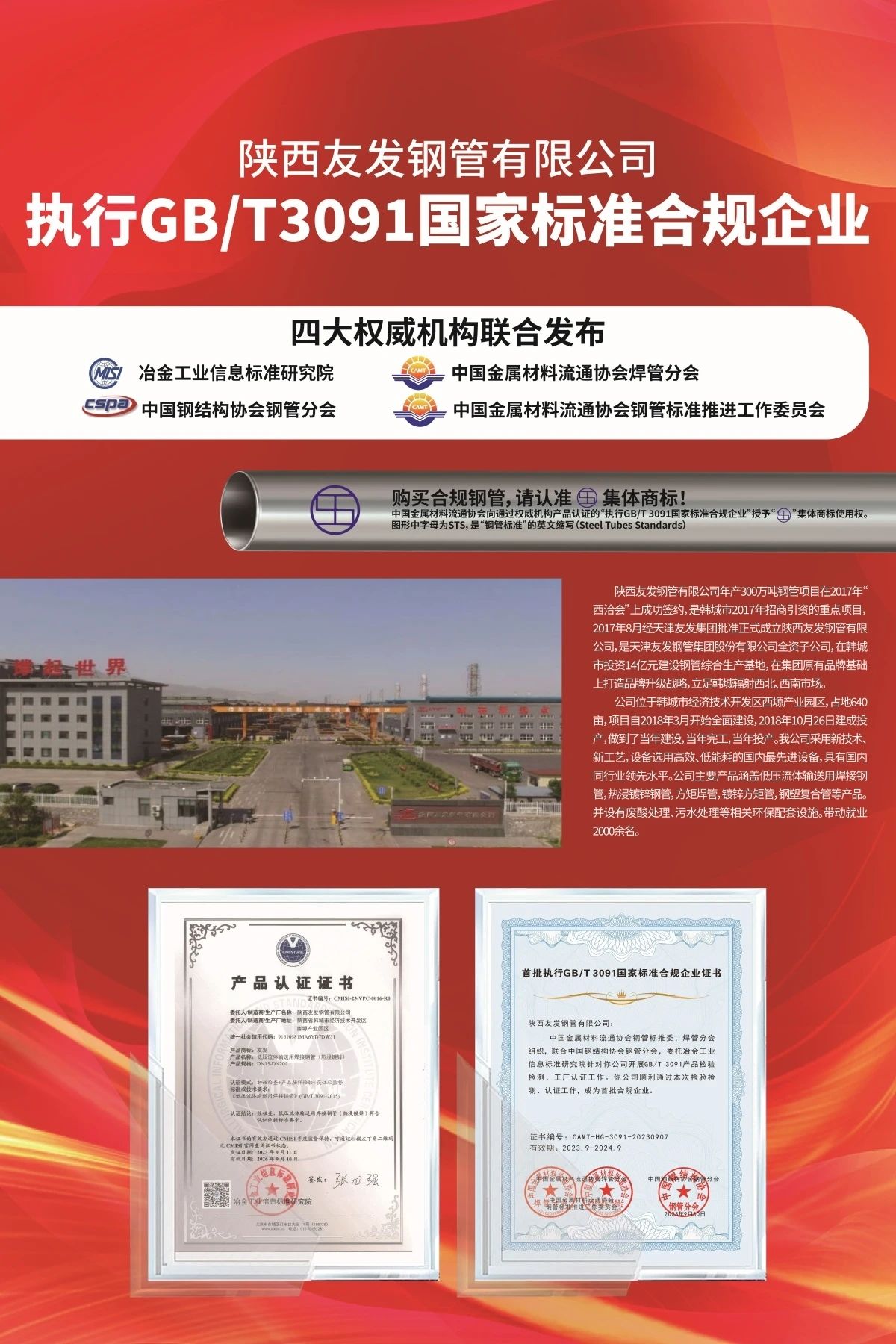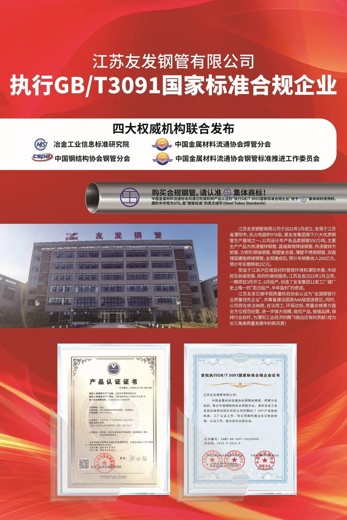 10月16日,由四大權(quán)威機(jī)構(gòu)聯(lián)合發(fā)布的首批入圍《執(zhí)行GB/T 3091國(guó)家標(biāo)準(zhǔn)合規(guī)企業(yè)名錄》的14家企業(yè)中,有5家為友發(fā)集團(tuán)旗下企業(yè)。分別為友發(fā)集團(tuán)第一分公司、唐山正元管業(yè)、邯鄲友發(fā)、陜西友發(fā)和江蘇友發(fā),涵蓋友發(fā)集團(tuán)全部鍍鋅圓管產(chǎn)品。