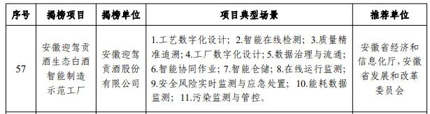 根據(jù)公告,迎駕貢酒共有11個經(jīng)典場景上榜,包括工藝數(shù)字化設(shè)計、智能在線檢測、質(zhì)量精準(zhǔn)追溯、工廠數(shù)字化設(shè)計、數(shù)據(jù)治理與流通、智能協(xié)同作業(yè)、智能倉儲、在線運(yùn)行監(jiān)測、安全風(fēng)險實(shí)時監(jiān)測與應(yīng)急處置、能耗數(shù)據(jù)監(jiān)測、污染監(jiān)測與管控。
