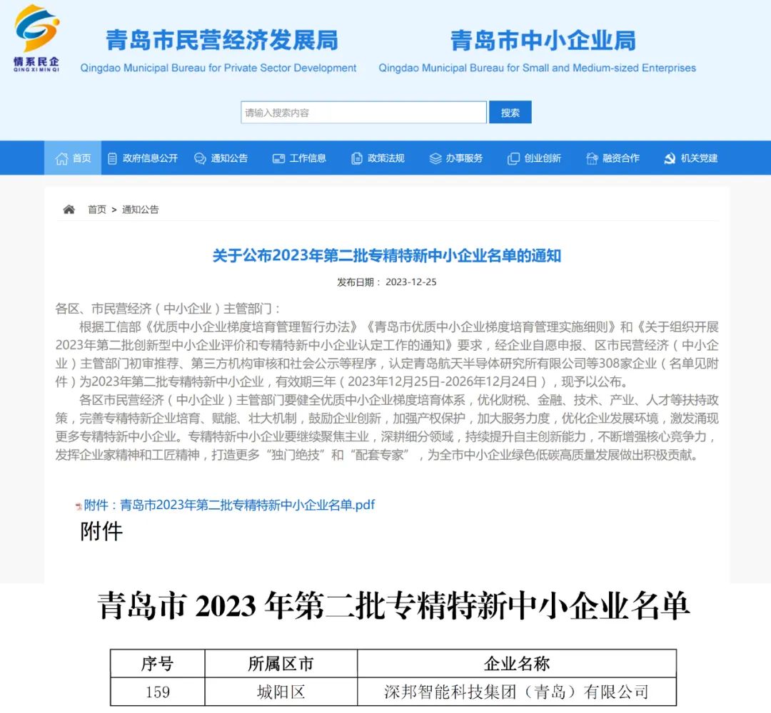 12月25日,青島市民營經(jīng)濟(jì)發(fā)展局發(fā)布了《關(guān)于公示2023年第二批專精特新中小企業(yè)名單的通知》,深邦集團(tuán)憑借卓越的創(chuàng)新技術(shù)、完善的產(chǎn)品體系、高效的運(yùn)營模式以及穩(wěn)健的經(jīng)營實力順利通過層層審核,獲評2023年第二批“專精特新”中小企業(yè)。