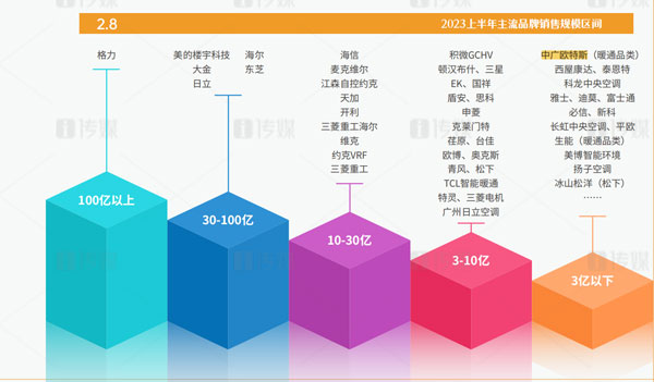 作為“熱泵行業(yè)領軍品牌”的中廣歐特斯,從2018年起逐步轉型向暖通與舒適家居領域滲透。經過多年積累,中廣歐特斯在2023年上半年依然保持著逆勢而上的發(fā)展優(yōu)勢,在主流品牌3億以下銷售規(guī)模中占據頭部位置。
