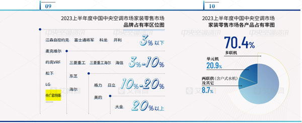 產品方面,多聯機、單元機和兩聯供是家裝零售市場的三大主力產品,多聯機占比為70.4%,單元機占比為20.9%,兩聯供(含戶式水機)及其它占比為8.7%。