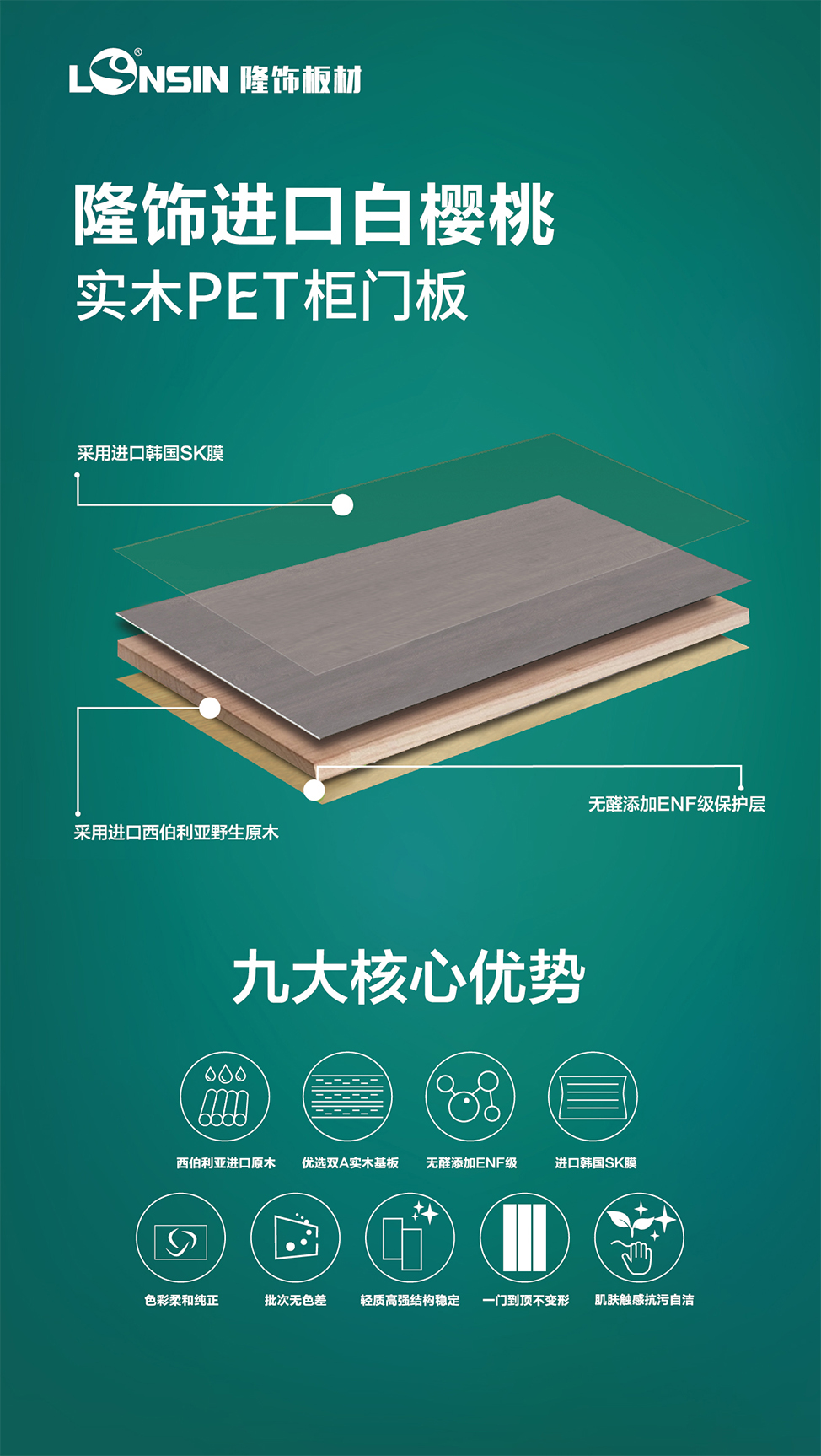 “提升高品質(zhì)服務(wù)、推動(dòng)綠色家居產(chǎn)業(yè)發(fā)展”是隆飾板材一直以來(lái)的發(fā)展使命,多年來(lái),隆飾從未停止研發(fā)創(chuàng)新的步伐,不斷與時(shí)俱進(jìn),將“工匠精神”融入每一個(gè)環(huán)節(jié)中,打造更具競(jìng)爭(zhēng)力的優(yōu)勢(shì)產(chǎn)品和服務(wù)。不僅有一直引以為傲的ENF級(jí)生態(tài)板和市場(chǎng)大熱的家具板,隆飾還將重磅推出全新高端產(chǎn)品——“ENF級(jí)進(jìn)口白櫻桃高端實(shí)木精板”,滿足了消費(fèi)者對(duì)環(huán)保和品質(zhì)愈發(fā)強(qiáng)烈的追求。