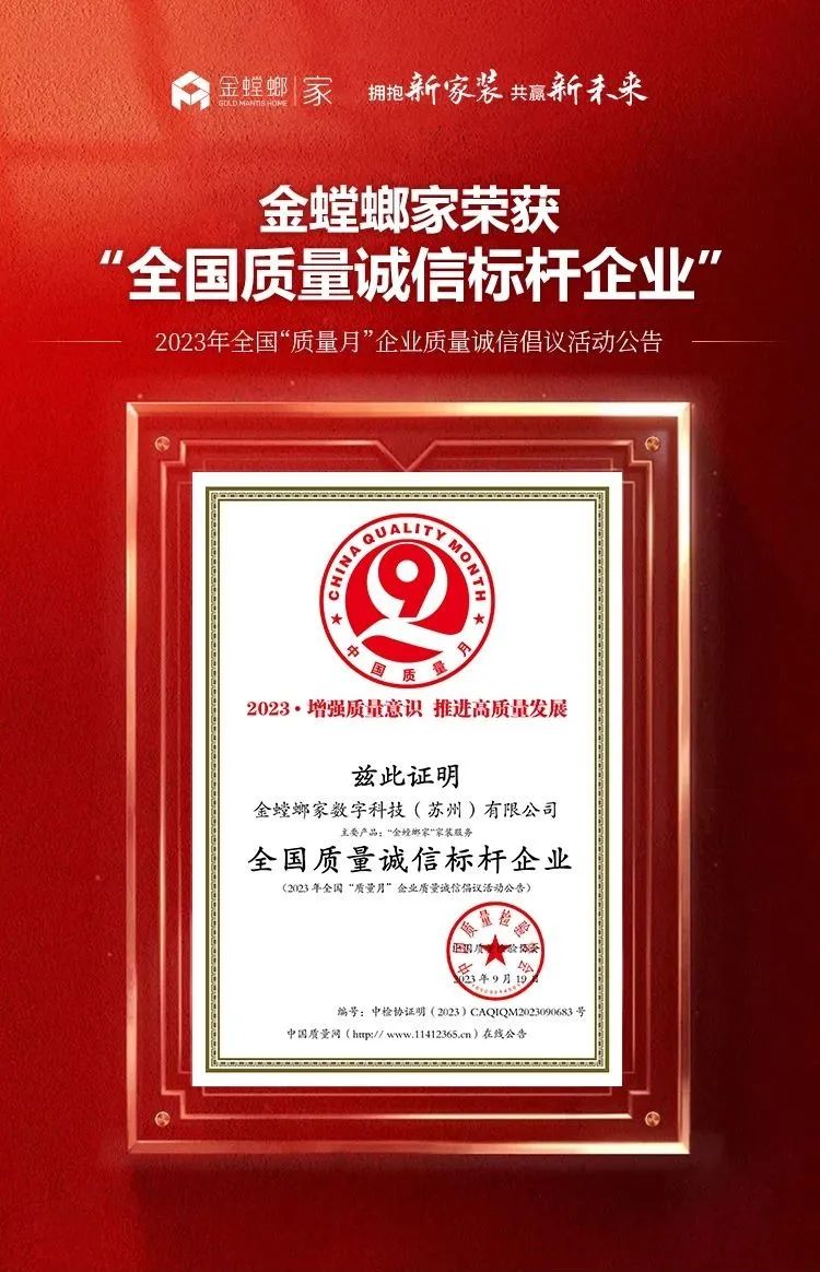 抓好質(zhì)量提升,共筑質(zhì)量誠(chéng)信!2023年9月,金螳螂家在一年一度的全國(guó)“質(zhì)量月”中再獲殊榮,榮獲“2023·增強(qiáng)質(zhì)量意識(shí),推進(jìn)高質(zhì)量發(fā)展”全國(guó)“質(zhì)量月”活動(dòng)“全國(guó)質(zhì)量誠(chéng)信標(biāo)桿企業(yè)”榮譽(yù)稱號(hào)。