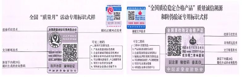 【全國“質(zhì)量月”活動專用標識】具有專屬的知識產(chǎn)權(經(jīng)中國版權保護中心審核,國家版權局于2015年7月16日對全國“質(zhì)量月”活動專用標識頒發(fā)了《作品登記證書》,登記號:國作登字-2015-L-00188457),基本規(guī)格為5cm2,集電話電碼防偽查詢、二維碼在線掃描、微信驗證、網(wǎng)站查詢等多種功能于一體,綜合運用了紐索幣紋、微縮文字、熒光激發(fā)油墨等多種防偽技術;專用標識加貼在企業(yè)產(chǎn)品或包裝上,消費者(用戶)只需要用座機或手機電話撥打全國范圍內(nèi)均不需要加區(qū)號的特服號碼95105365或使用手機掃描二維碼或登陸網(wǎng)站(http://www.12365114.cn)就可直接查詢驗證加貼專用標識的產(chǎn)品為第三方質(zhì)量專業(yè)機構權威證明的全國質(zhì)量誠信優(yōu)秀典型企業(yè)生產(chǎn)(銷售)的質(zhì)量誠信安全可靠好產(chǎn)品,形成企業(yè)自己獨有的比較優(yōu)勢。