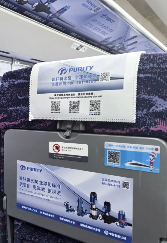 “普軒特號(hào)”高鐵專列以“普軒特水泵,全球化標(biāo)準(zhǔn)”為主旨,在車廂內(nèi)以全面覆蓋的宣傳形式,將專列打造成展示普軒特形象的“移動(dòng)展廳”,深度刻畫普軒特對全球標(biāo)準(zhǔn)的堅(jiān)定態(tài)度