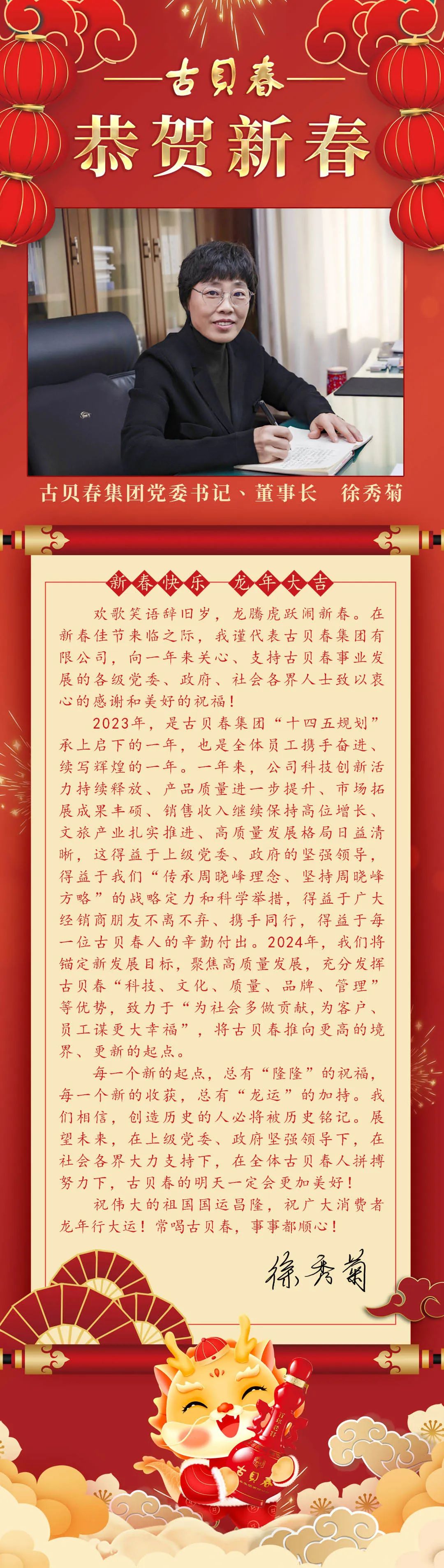 古貝春集團(tuán)有限公司黨委書(shū)記、董事長(zhǎng)徐秀菊攜全體員工恭祝全國(guó)人民新春快樂(lè)!