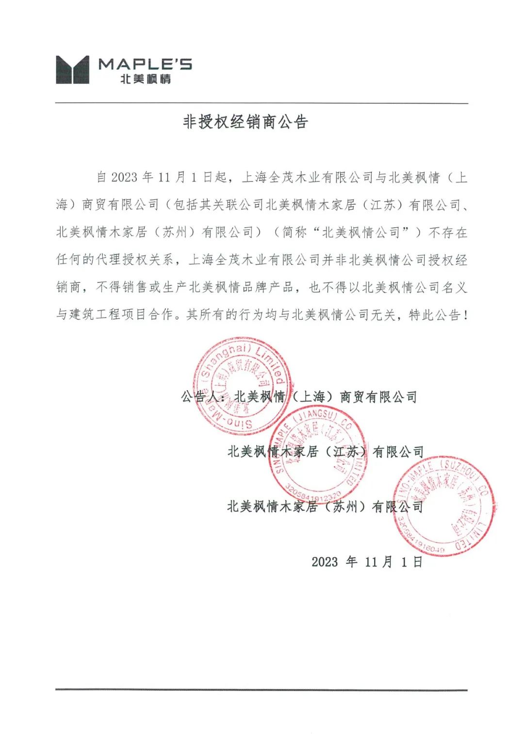 自2023年11月1日起,上海全茂木業(yè)有限公司與北美楓情 (上海)商貿(mào)有限公司(包括其關聯(lián)公司北美楓情木家居(江蘇)有限公司、北美楓情木家居(蘇州)有限公司)(《簡稱“北美楓情公司”)不存在任何的代理授權關系,上海全茂木業(yè)有限公司并非北美楓情公司授權經(jīng)銷商,不得銷售或生產(chǎn)北美楓情品牌產(chǎn)品,也不得以北美楓情公司名義與建筑工程項目合作。其所有的行為均與北美楓情公司無關,特此公告!