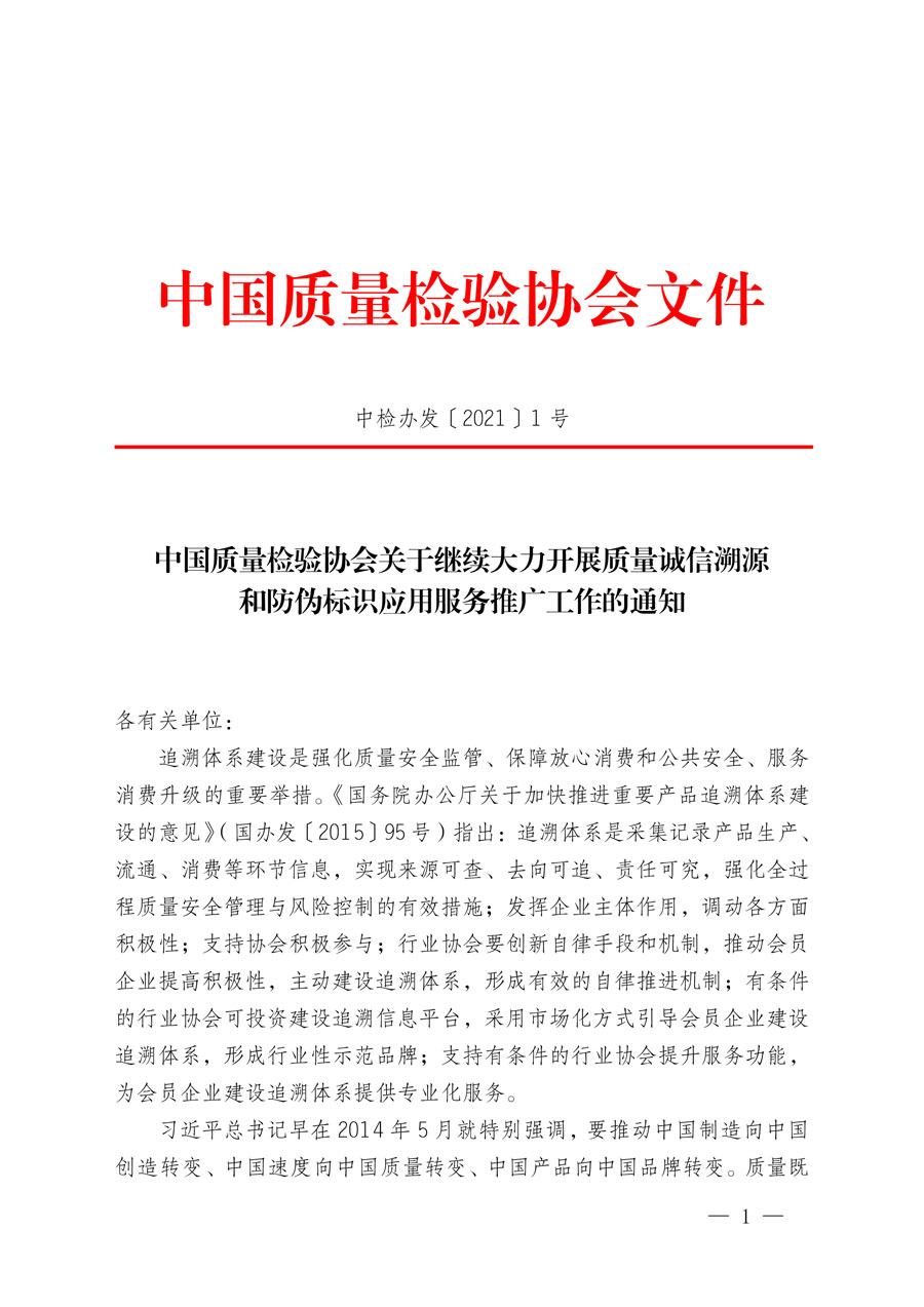 中國質(zhì)量檢驗(yàn)協(xié)會(huì)關(guān)于繼續(xù)大力開展質(zhì)量誠信溯源