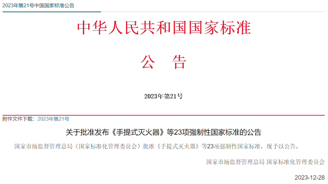 關于批準發(fā)布《手提式滅火器》等23項強制性國家標準的公告