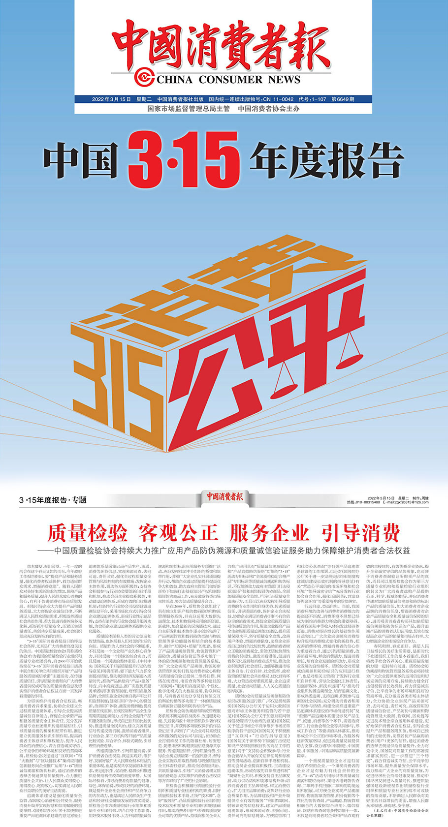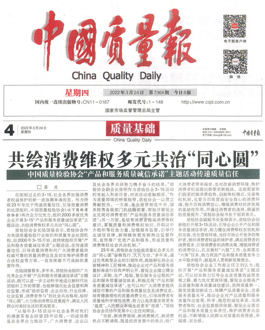 中國質(zhì)量報(3月15日刊第2版):推動質(zhì)量共治 優(yōu)化營商環(huán)境 共筑質(zhì)量誠信——中國質(zhì)量檢驗協(xié)會攜手2000余家企業(yè)組織開展“3 ·15”產(chǎn)品和服務質(zhì)量誠信承諾主題活動