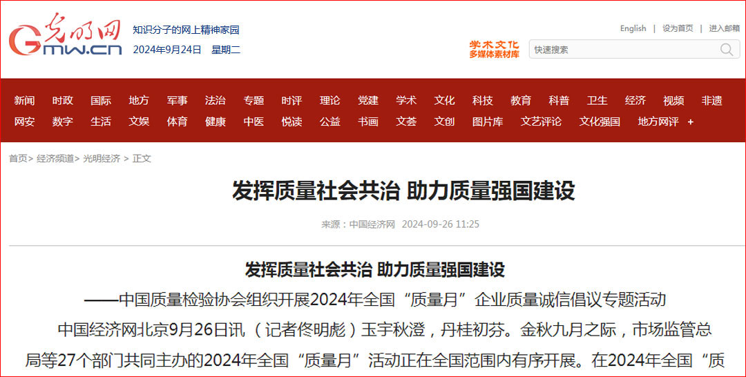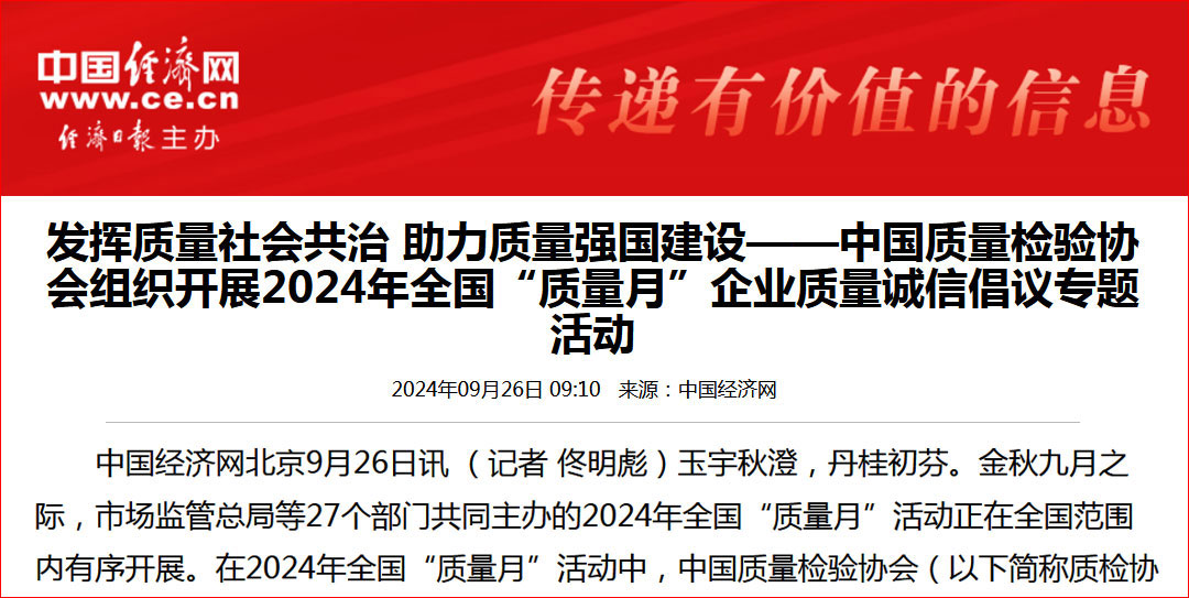 中國(guó)經(jīng)濟(jì)網(wǎng)—全國(guó)“質(zhì)量月”千家企業(yè)倡議:共筑質(zhì)量誠(chéng)信 建設(shè)質(zhì)量強(qiáng)國(guó)——中國(guó)質(zhì)量檢驗(yàn)協(xié)會(huì)組織開展2024年全國(guó)“質(zhì)量月”企業(yè)質(zhì)量誠(chéng)信倡議活動(dòng)