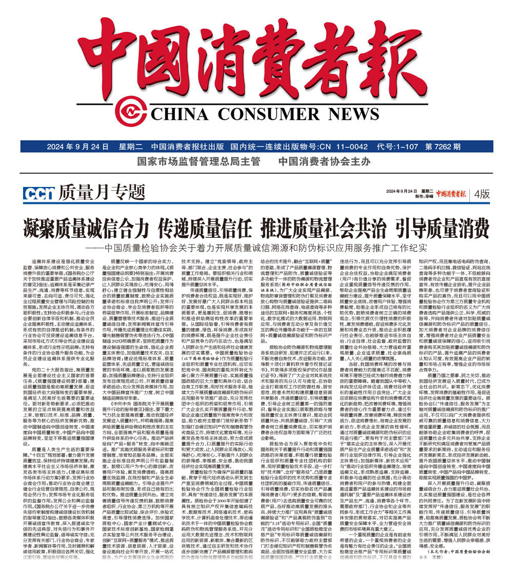 中國(guó)消費(fèi)者報(bào)—凝聚質(zhì)量誠(chéng)信合力 傳遞質(zhì)量信任 推進(jìn)質(zhì)量社會(huì)共治 引導(dǎo)質(zhì)量消費(fèi)——中國(guó)質(zhì)量檢驗(yàn)協(xié)會(huì)關(guān)于著力開展質(zhì)量誠(chéng)信溯源和防偽標(biāo)識(shí)應(yīng)用服務(wù)推廣工作紀(jì)實(shí)