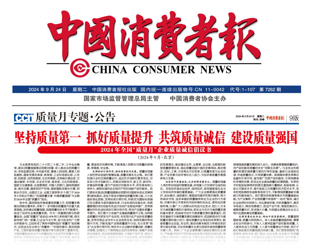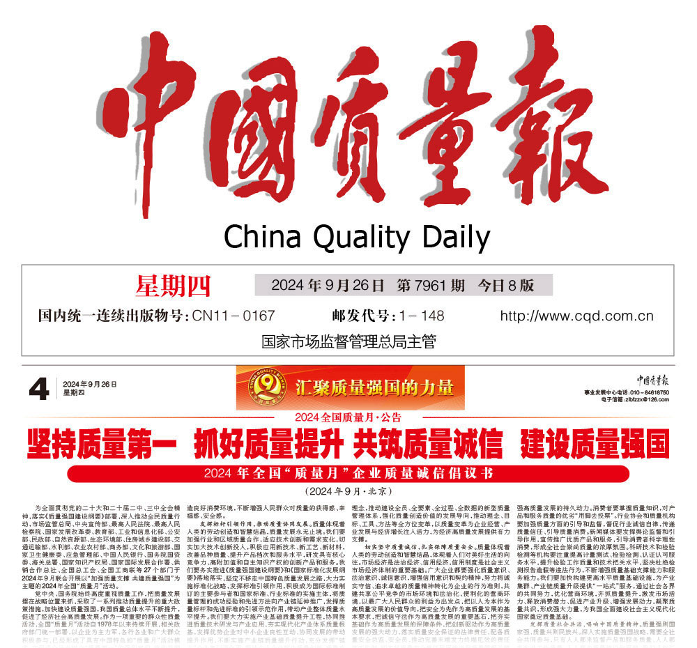 中國(guó)質(zhì)量報(bào)—堅(jiān)持質(zhì)量第一抓好質(zhì)量提升 共筑質(zhì)量誠(chéng)信 建設(shè)質(zhì)量強(qiáng)國(guó)——2024年全國(guó)“質(zhì)量月”企業(yè)質(zhì)量誠(chéng)信倡議書(2024年9月·北京)