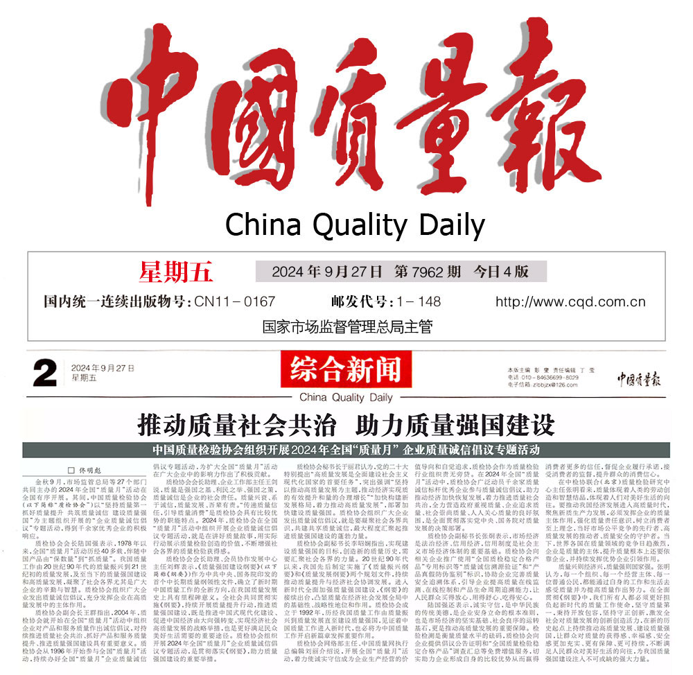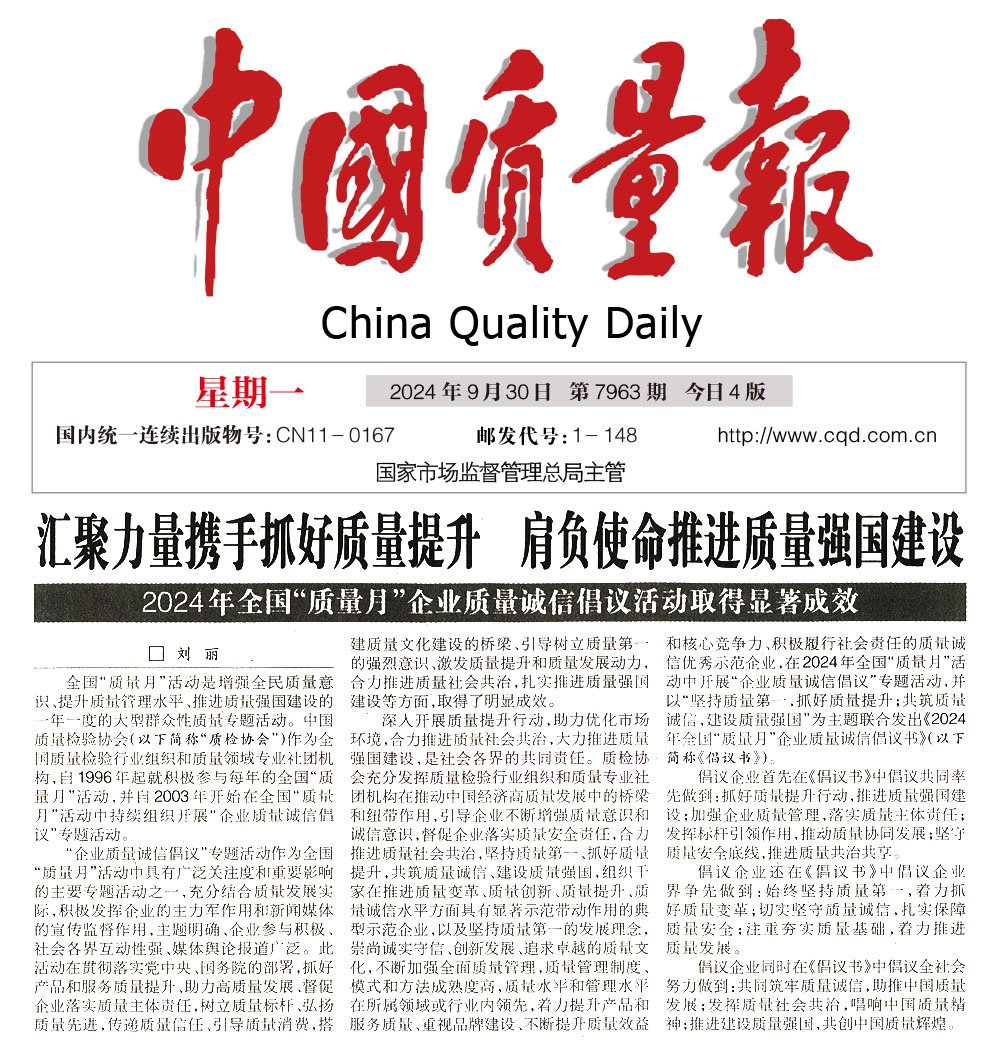 中國(guó)質(zhì)量報(bào)—堅(jiān)持質(zhì)量第一推動(dòng)質(zhì)量社會(huì)共治 助力質(zhì)量強(qiáng)國(guó)建設(shè)——中國(guó)質(zhì)量檢驗(yàn)協(xié)會(huì)組織開展2024年全國(guó)“質(zhì)量月” 企業(yè)質(zhì)量誠(chéng)信倡議專題活動(dòng)